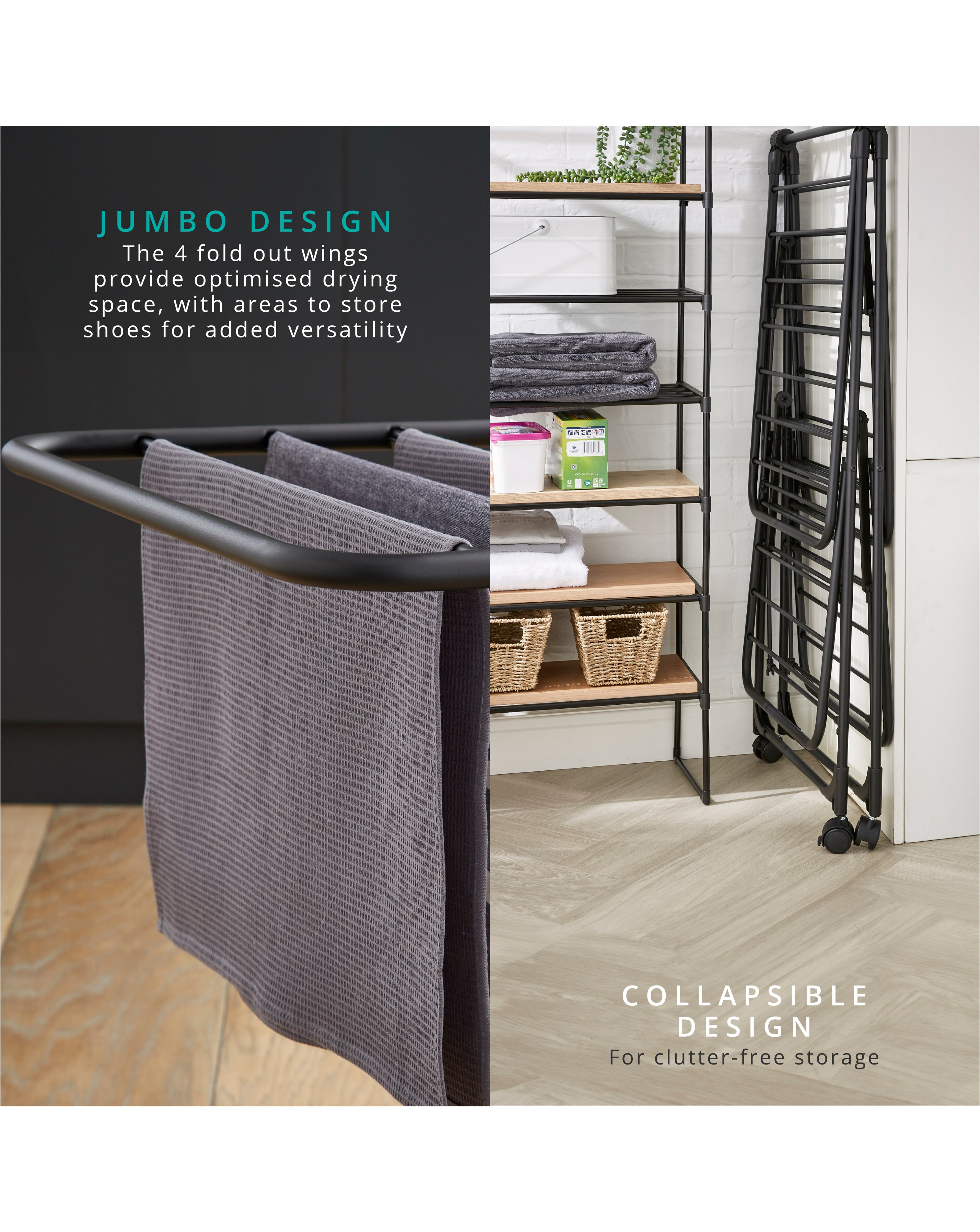 The premium Swan SWLC1003BLKN Stealth jumbo clothes airer is the most cost-effective alternative to your tumble dryer. Featuring 4 fold out wings and flat areas for shoes, its versatile and easy to use.