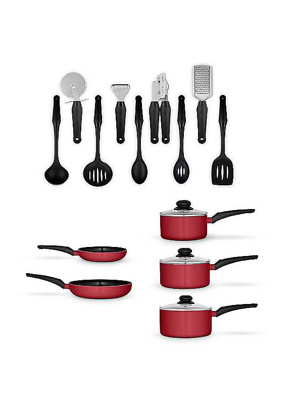 Your Complete Kitchen Collection: This 14 piece set is your complete kitchen collection, featuring all your essential cooking items. You get 3 Saucepans with glass lids, 2 Frying Pans, along with a 9 piece tool set including a Ladle/Y Peeler/Grater/Pizza Cutter/Can Opener/Slotted Spoon/Solid Spoon/Slotted Turner and Skimmer.Set consists of 16/18/20cm saucepans with 20/26 frying pansConstructed from high quality pressed aluminiumFeaturing ceramic non-stick interior coatingHeat resistant exterior coatingBakelite handles with hanging loops for easy storageSuitable for all hob types excluding induction9 Piece tool set perfect for every day kitchen needsLadle / Y Peeler / Grater / Pizza Cutter / Can OpenerSlotted Spoon / Solid Spoon / Slotted Turner / SkimmerOven safe up to 170 degrees for up to 40 minutes