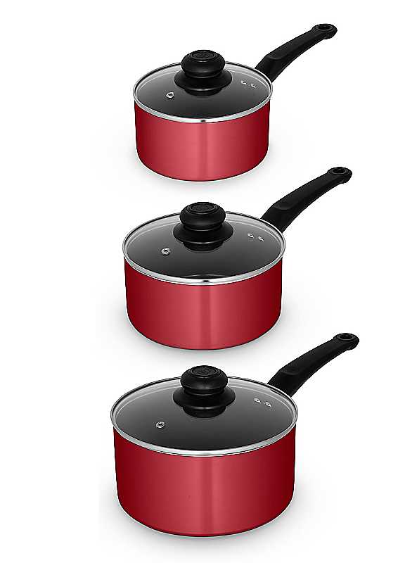 This Swan Townhouse 3 piece red saucepan set is your complete kitchen collection, featuring all your cookware. You get 16, 18 and 20cm high quality aluminium saucepans. A ceramic non-stick coating makes this the best cookware set for all your cooking needs. Little to no oil is needed, making it a healthier way to cook your favourite meals. The Bakelite handles are heat-resistant and provide a comfortable grip, complete with built-in loops for hanging them on your wall. Our non-stick cookware set includes tempered glass lids, letting you safely monitor the progress without needing to remove the lid. This cookware is suitable for use on all hob types, excluding induction and oven safe up to 150°C for up to 40 mins. The Swan Townhouse collection combines striking modern design with beautiful detailing in sleek finishes with coordinated colours.Set consists of 16/18/20cm saucepansConstructed from high quality pressed aluminiumFeaturing ceramic non-stick interior coatingHeat resistant exterior coatingBakelite handles with hanging loops for easy storageTempered glass lids with steam release ventsSuitable for all hob types excluding inductionPart of the Townhouse collectionOven safe up to 170 degrees for up to 40 minutesHand wash recommended