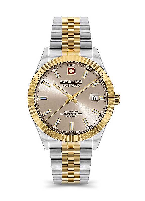 Swiss Military Silver & Yellow Gold Two Tone Stainless Steel Metal Bracelet Watch with Warm Grey Dial.Brand: Swiss MilitaryCase Colour: Stainless Steel (Or) Silver & Yellow Gold Two ToneATM: 10Crystal: Clear Flat Sapphire GlassDial colour: Warm greyStrap type: Metal BraceletStrap material: Stainless SteelBand colour: Stainless Steel (Or) Silver & Yellow Gold Two ToneFunction: Automatic with Self WindingMovement: Swiss Made Soprod automatic SOP024HH1D3BWStainless SteelCase diameter approx. 41 mm | round dial watch, stainless steel watch, fluted bezel watch, metal strap watch, two tone watch, automatic watch, mens watch