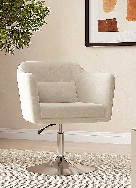 This retro-inspired tub vanity chair brings a timeless, stylish touch to any room, offering both elegance and comfort. Its classic design works effortlessly with a variety of room palettes, making it a versatile addition to your home. Whether placed in the living room, bedroom, or as part of your vanity setup, this chair will elevate your space with its chic look. Adjustable in height from 45cm to 57cm, this vanity chair offers flexibility to set the perfect position for your comfort. The under-seat lever allows you to easily adjust the height to suit your needs, while the 360° swivel movement ensures smooth and effortless gliding, allowing you to turn and move without any hassle. The steel frame provides a strong core for durability, and the large round base ensures excellent balance and stability. Designed with comfort in mind, the chair is filled with thick sponge padding and wrapped in breathable linen-feel fabric, offering a soft and supportive seating experience. A large seat cushion and a small back pillow are included to further enhance your comfort.Weight capacity: 136 kgAssembly required (minimal assembly)Linen (100% Polyester), Sponge, SteelOverall dimensions approx. 79-91H x 60W x 60D cmSeat dimensions approx. 45-57H x 47W x 46D cm Back dimensions approx. 35.5H x 46W cmPlease remember to measure your available space before ordering. If using on an un-carpeted floor we recommend rubber or felt protection pads be used under the legs to avoid damage to your floors.