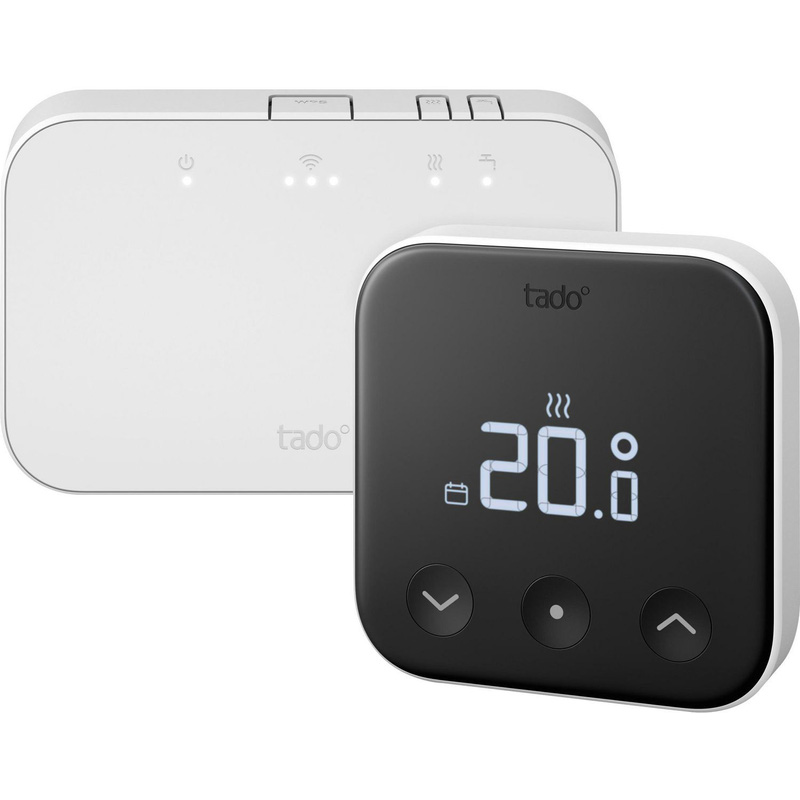 * Innovative features; smart schedules, geofencing & open window detection (no sensor required) * Compatible with almost all gas boilers & water-based underfloor heating systems controlled by a thermostat * Matter-enabled * 10-year warranty (Requires opt-in with Tado) The tadodeg Wireless Smart Thermostat X helps you save energy and money with unique features like Smart Schedules, advanced Geofencing and Open Window Detection, without needing extra sensors. You can control the temperature in each room from anywhere using the app. Tadodeg users save an average of 22% on energy consumption. This thermostat is compatible with almost all gas boilers and water-based underfloor heating systems controlled by a thermostat. * OpenTherm technology – helps save an average of 22% on energy use. * Smart features – includes smart schedules, geofencing and open window detection. * Matter-enabled – for wide smart home compatibility. * Expert design – developed by the experts in smart heating. * 10-year warranty – requires opt-in with Tado. Not compatible with tadodeg Smart Thermostats from the V3+ line or older. | Tado X Wireless Smart Thermostat Starter Kit incl. Programmer with Hot Water Control and OpenTherm in Black/White