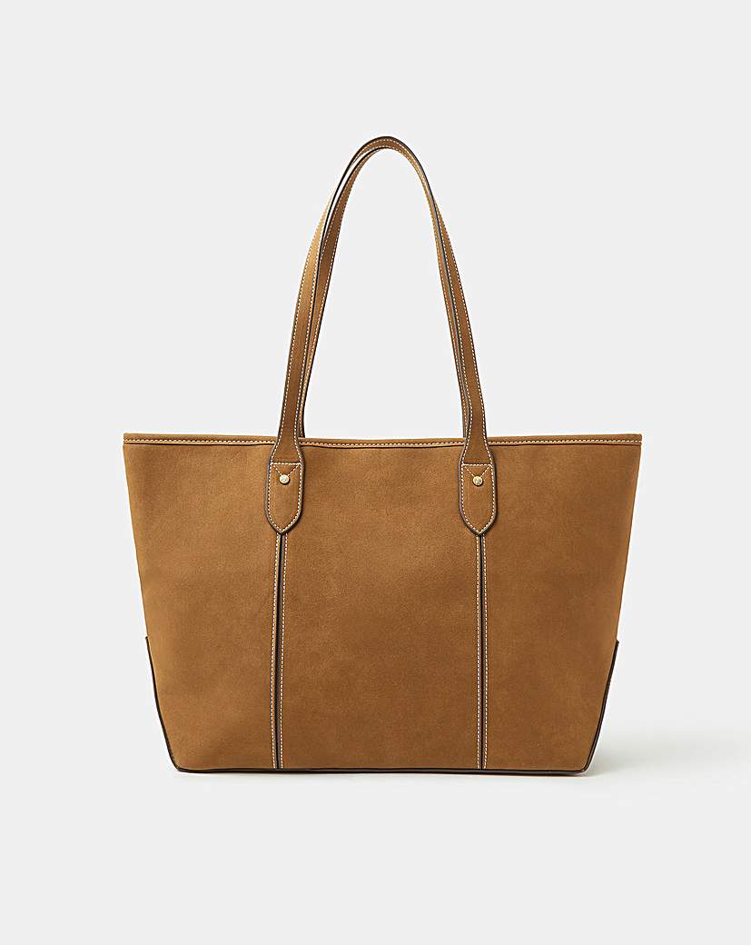 Accessorize Faux Suede Tote Bag Super chic and stylish, this tote bag is perfect for housing all your daily essentials. Designed with faux suede in a rich tan hue, it features two shoulder straps, a zip closure, and a small zip pocket inside. Outer: Polyurethane (Pu) 100% Lining: Polyester (Recycled) 100%