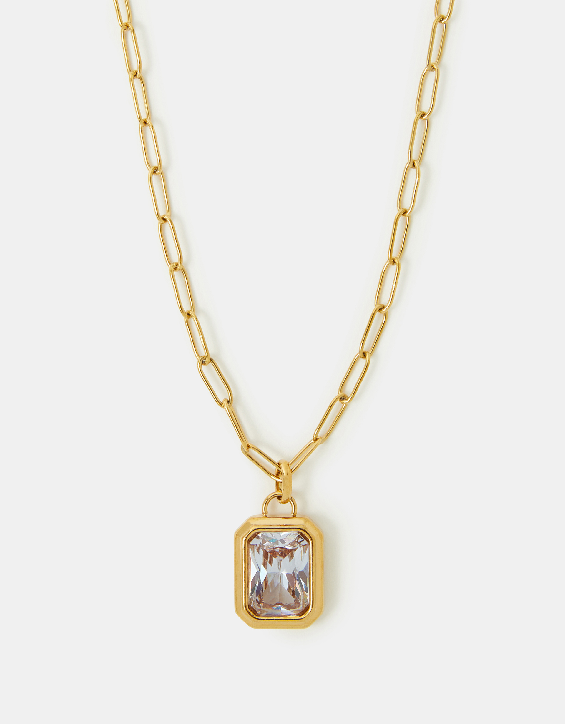 Part of our Stainless Steel Jewellery collection: designed with PVD coating for a longer-lasting, waterproof and low-maintenance finish.Pretend it's vintage. Designed on a paperclip chain, this necklace showcases a rectangular pendant framing a chunky diamanté stone.