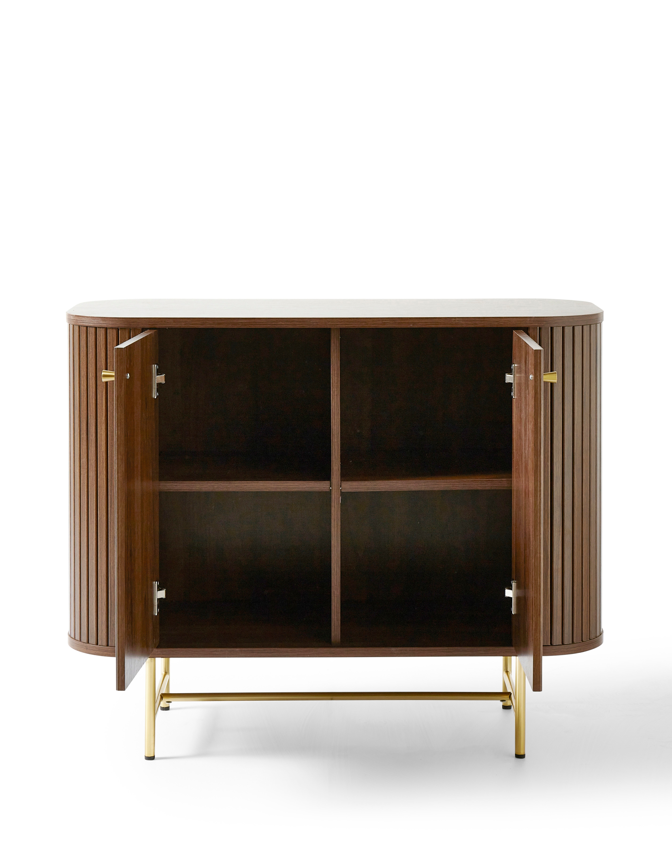 The Tate Small Sideboard features a slatted front with a grained wood effect and brass coloured handles. Has 1 shelf, Self assembly.
