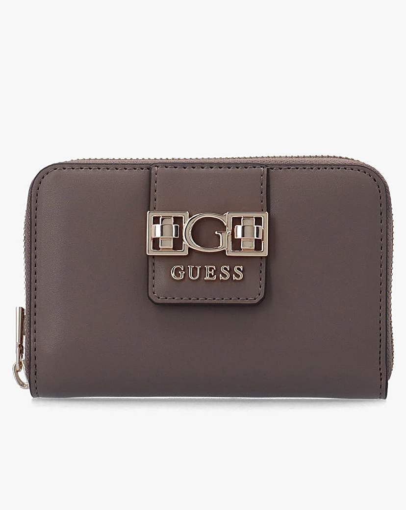 Guess Jane Medium Dark Taupe Zip Around Wallet Add the Guess Jane Medium Taupe Zip Around Wallet to your accessories collection. This carryall wallet features a smooth design with polished gold tone accents. The secure zip around fastener allows access to multiple handy compartments, ideal for keeping all your coins, notes and cards in check. Snaffle hardware with 'G' logo adds detail to the front of the purse. Signature Guess branding completes the design. Technical information: Smooth Design, Gold Tone Hardware, Zip Around Fastening, Multiple Compartments, Snaffle G Logo Detail, Guess Branding, Comes In Gift Box Dimensions: L14 x H9.5 x D2.5 CM