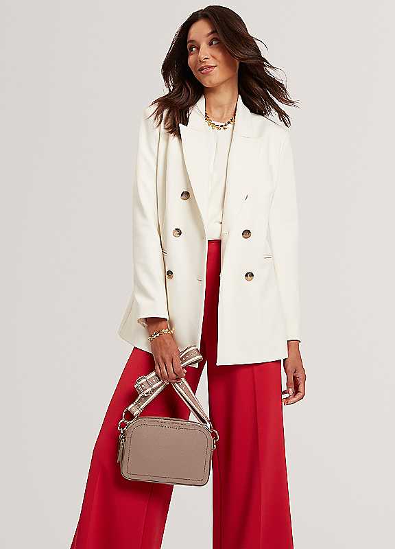 Where function meets fashion, the LUCEELE Crossbody Bag. Crafted from smooth leather with a statement webbing strap, it offers a modern silhouette and hands-free ease. Outer: 100% Bovine Leather Lining: 100% Cotton | taupe crossbody bag, neutral crossbody bag, structured leather bag, thick strap crossbody, leather crossbody bag, smooth leather purse, long strap crossbody