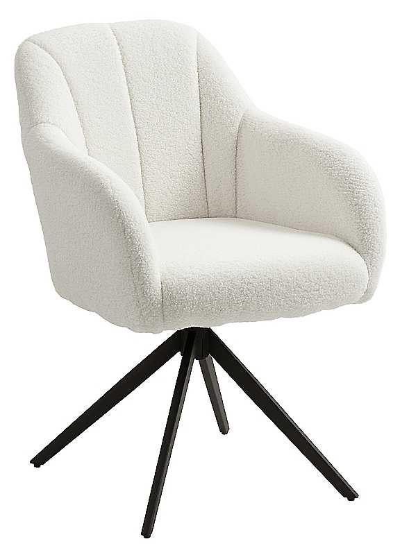 Experience luxurious comfort and modern style with this elegant swivel chair, perfect for your living room, bedroom, or workspace. Upholstered in soft, teddy fleece, with a thick 13 cm high-density foam seat that offers a cosy yet supportive feel. Rotate smoothly to reach all your essentials or check your look from every angle-ideal for makeup, hairstyling, or casual lounging. Features a curved silhouette with chic channel tufting and a contemporary spider-leg base in powder-coated steel, blending sophistication with modern flair. Robust steel legs provide strong support up to 120 kg. Adjustable foot pads ensure stability on uneven floors and protect your surfaces. Quick, hassle-free setup in just three simple steps with clear instructions. Weight capacity: 120 kg Channel tufting backrest complements modern room aesthetics 13cm thick seat and curved design enhance sitting pleasure 360° swivel seat allows easy access to items around Channel tufting backrest complements modern room aesthetics Robust support ensured by powder-coated steel legs in spider structure Adjustable foot pads accommodate uneven surfaces Suitable for living rooms, study rooms and bedrooms Easy to assemble Item Label: 83B-423V70WT Teddy Fleece (100% Polyester), Foam, Steel Overall dimensions approx. 86H x 56W x 63D cm Seat dimensions approx. 51H x 45W x 46D cm Seat thickness approx. 13 cm Back size approx.: 40L x 51W cm Back thickness approx. 8 cm Armrest height to seat: 18 cm Please remember to measure your available space before ordering. If using on an un-carpeted floor we recommend rubber or felt protection pads be used under the legs to avoid damage to your floors. | comfy swivel chair, tufted accent chair, white swivel chair, swivel accent chair