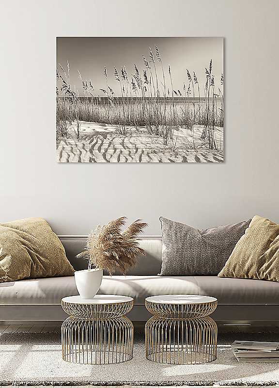 Textural brushstrokes and earthy tones reflect the beauty of windswept dunes. This canvas brings natural balance and understated elegance to any room.Polyester canvas, Wood frame, Latex inkDimensions approx. 60 x 80 x 1.8 cm | textured canvas, canvas art, wood framed canvas, nature canvas painting, landscape canvas