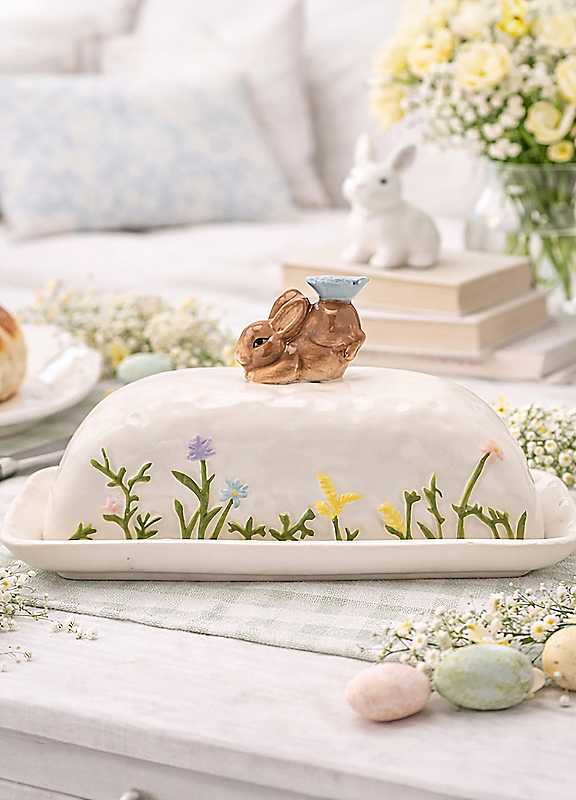 Bring a touch of springtime charm to your kitchen with this adorable bunny butter dish from The Eggs-traordinary Gifting Co. Featuring a delicate meadow design and a playful bunny perched on top holding a tiny blue flower, it's perfect for brightening up your breakfast table. The pastel tones and textured ceramic finish create a delightful, handcrafted look that captures the essence of Easter and nature's renewal. A lovely mix of fun and function, it also makes a thoughtful seasonal gift.Hand wash onlyDimensions approx. 10D x 19W x 12H cm