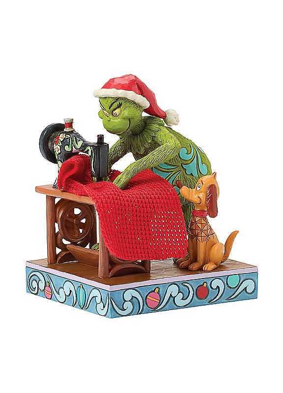 Inspired by his scheme to steal Christmas, The Grinch sews his Santa suit as Max watches curiously by his side. Complete with Jim Shore's floral patterns on the sewing machine and signature detailing, this piece captures crafty holiday mischief.
