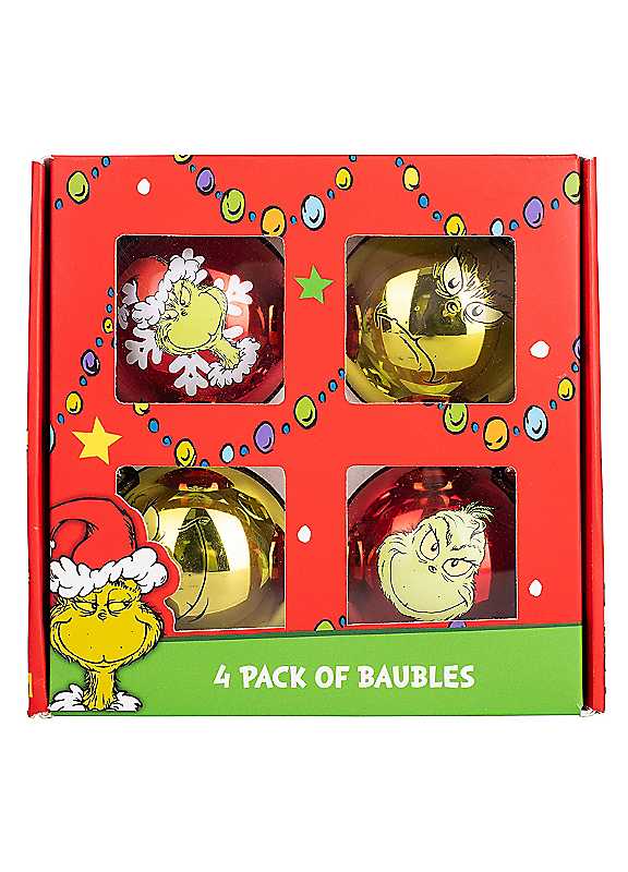 Bring Whoville charm to your tree with this vibrant 4-pack of official Grinch baubles. Each bauble features a unique design inspired by Dr. Seuss's iconic Christmas mischief-maker. Made of glass and crafted for decorative use only, these baubles are perfect for fans looking to add some Grinchy goodness to their holiday cheer. A festive must-have for anyone who loves a little holiday humour!