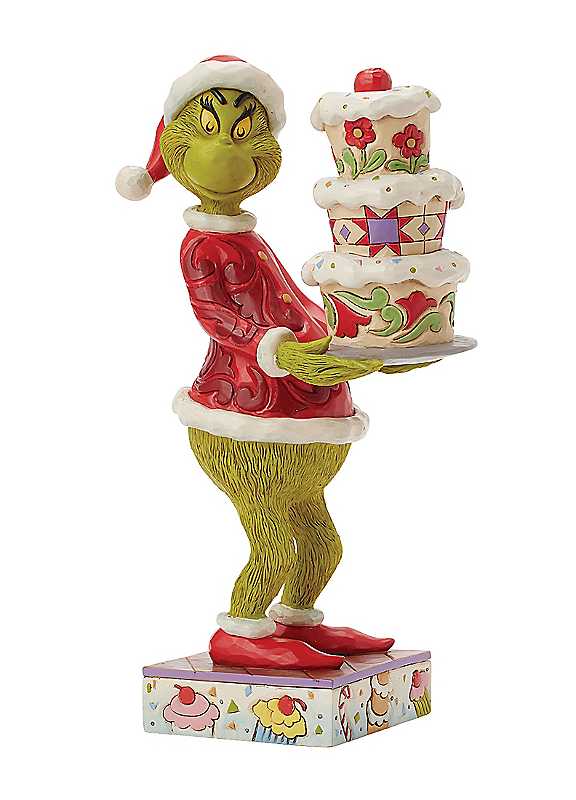 Disguised as Santa, The Grinch beams with trickery as he steals a towering cake. Adorned with Jim Shore's iconic rosemaling, patchwork patterns, and charming floral details, this piece captures the mischief of Christmas in true Grinch fashion.