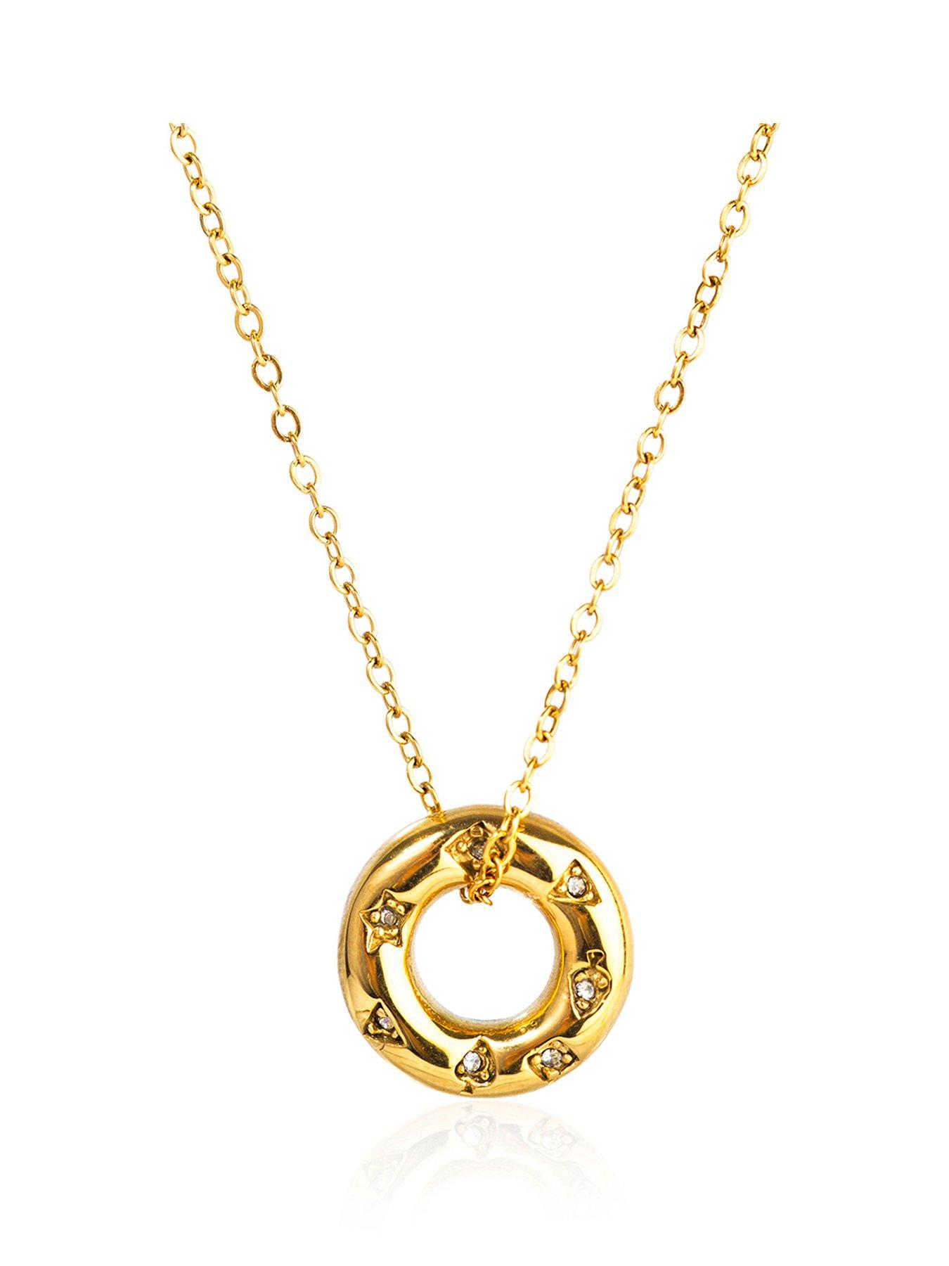 The Love Collection Gold Plated Stainless Steel Cz Donut Pendant Necklace This Gold-Plated Stainless Steel Necklace Showcases A Cubic Zirconia-Encrusted Donut Pendant. The Sparkling Stones Catch The Light Beautifully, Creating A Chic, Contemporary Look. Durable And Polished, It'S Suitable For Everyday Wear Or Special Occasions. Lightweight And Versatile, It Pairs Effortlessly With Other Jewellery, Offering A Playful Yet Sophisticated Accessory For Modern, Fashion-Forward Styling. Depth: 15 In Age Range: 3+ Clasp: Y Clasp Type: Springring Clasp Expandable: N Fashion Jewellery Type: Necklaces Metal Type: Stainless Steel Stone Type: Gem Gold Plated Stainless Steel Cz Donut Pendant Necklace Made From Stainless Steel Everyday Wear Will Arrive In Stylish Gift Box Waterproof Jewellery Tarnish Resistant Chain: 15" +2"