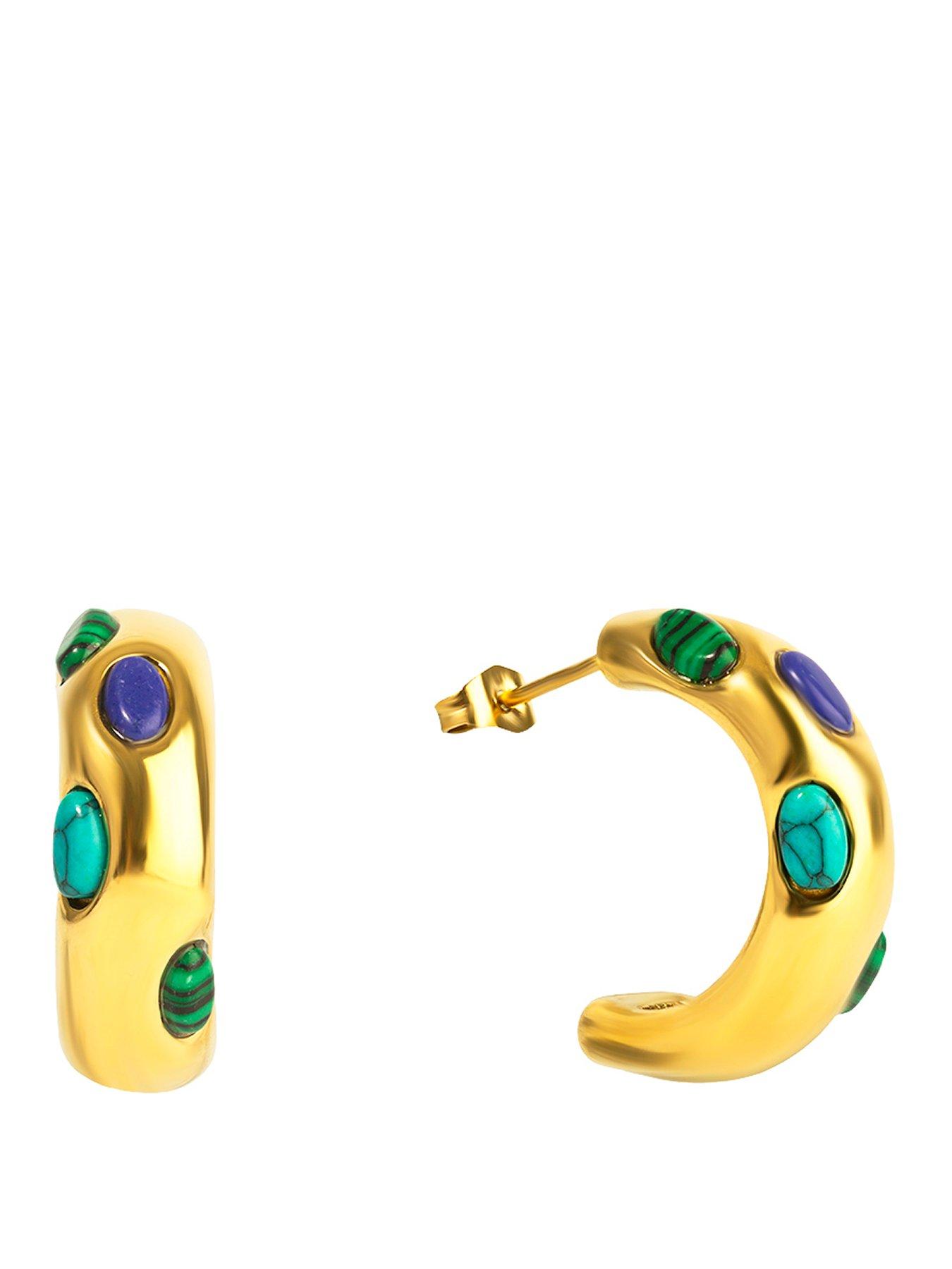 The Love Collection Gold Plated Stainless Steel Studded Malachite And Turquoise Stud Hoop These Gold-Plated Stainless Steel Hoop Earrings Are Studded With Malachite And Turquoise Stones, Offering Vibrant Colour And Striking Contrast. Durable And Polished, They Are Suitable For Daily Wear Or Layering. Lightweight Yet Visually Impactful, They Provide A Contemporary Boho-Chic Accessory. Perfect For Adding Colour And Texture, They Combine Modern Design With Natural Stone Charm. Height: 23 Mm Width: 15 Mm Age Range: 3+ Fashion Jewellery Type: Earrings Metal Type: Stainless Steel Gold Plated Stainless Steel Studded Malachite And Turquoise Stud Hoop Made From Stainless Steel Everyday Wear Will Arrive In Stylish Gift Box Waterproof Jewellery Tarnish Resistant Non Refundable Due To Hygiene