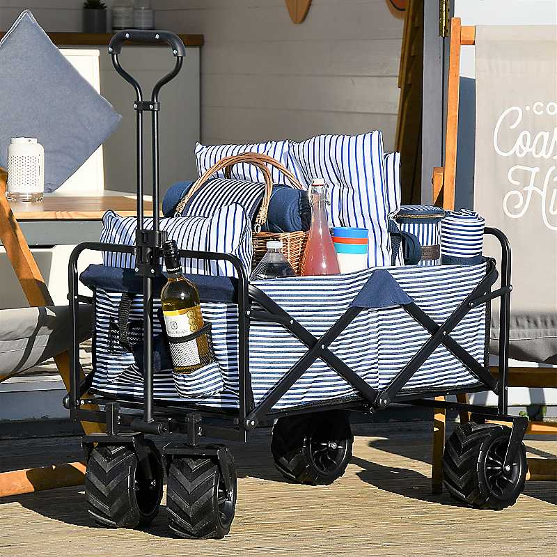 Three Rivers XL wagon.Perfect for camping, festivals, family picnics and days out.Featuring a handy storage cover, retractable and telescopic handles and front-wheel steering.The Wagon folds away in seconds making it ideal for popping in your car and keeping on hand whatever the eventuality. Wipe clean only Steel Frame with 600D Polyester lining Size approx. 85 x 75 x 50 cm