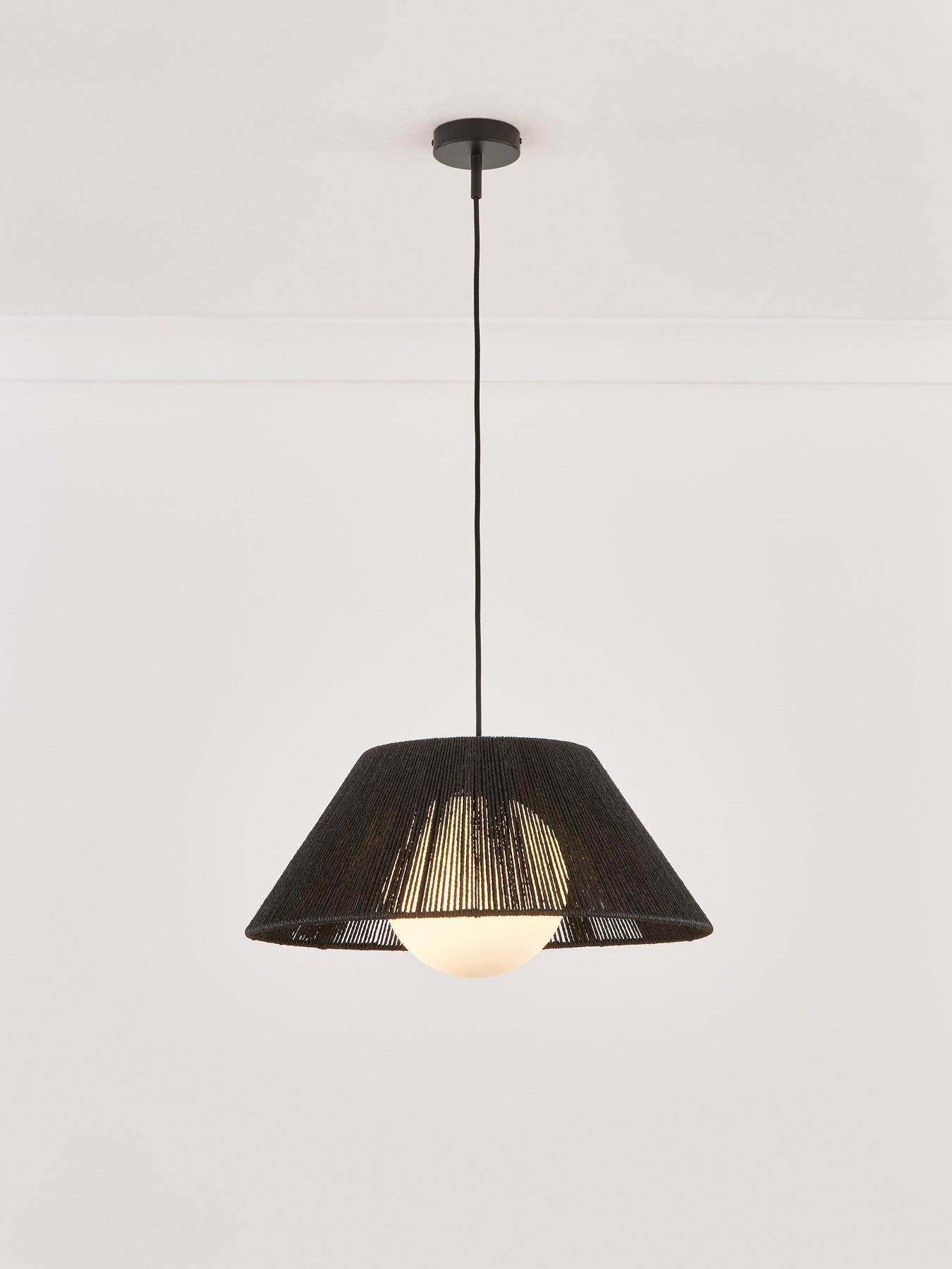 Very Home String Pendant With Opal Glass Create A Striking Focal Point With This Beautifully Crafted String Pendant Ceiling Light, Where Sculptural Texture Meets Soft Illumination. The Black Woven String Shade Forms An Elegant, Curved Silhouette That Adds Depth And Visual Interest, While Allowing Light To Filter Through For A Subtle Play Of Light And Shadow. At The Centre Sits A Smooth Opal Glass Globe, Softly Diffusing The Light To Create A Calm, Welcoming Glow. The Contrast Between The Dark String Outer And The Milky Glass Interior Gives This Pendant A Refined, Contemporary Edge That Works Effortlessly In Dining Areas, Living Spaces Or Bedrooms. Suspended From A Sleek Black Cord, This Pendant Feels Both Decorative And Understated, Making It Ideal For Modern Interiors That Favour Texture And Tone Over Heavy Detailing. Key Features Pendant Ceiling Light With Woven Black String Shade Opal Glass Globe Softly Diffuses The Light Creates Visual Texture And Gentle Light Patterning Ideal For Dining Rooms, Living Spaces Or Bedrooms Requires 1 X E27 Bulb (Not Included) Part Of The Very Home Lighting Collection Depth: 50 Cm Height: 123 Cm Material Content: Paper+Glass+Metal Width: 50 Cm Indoor / Outdoor: Indoor Maximum Wattage (In Kw): 60