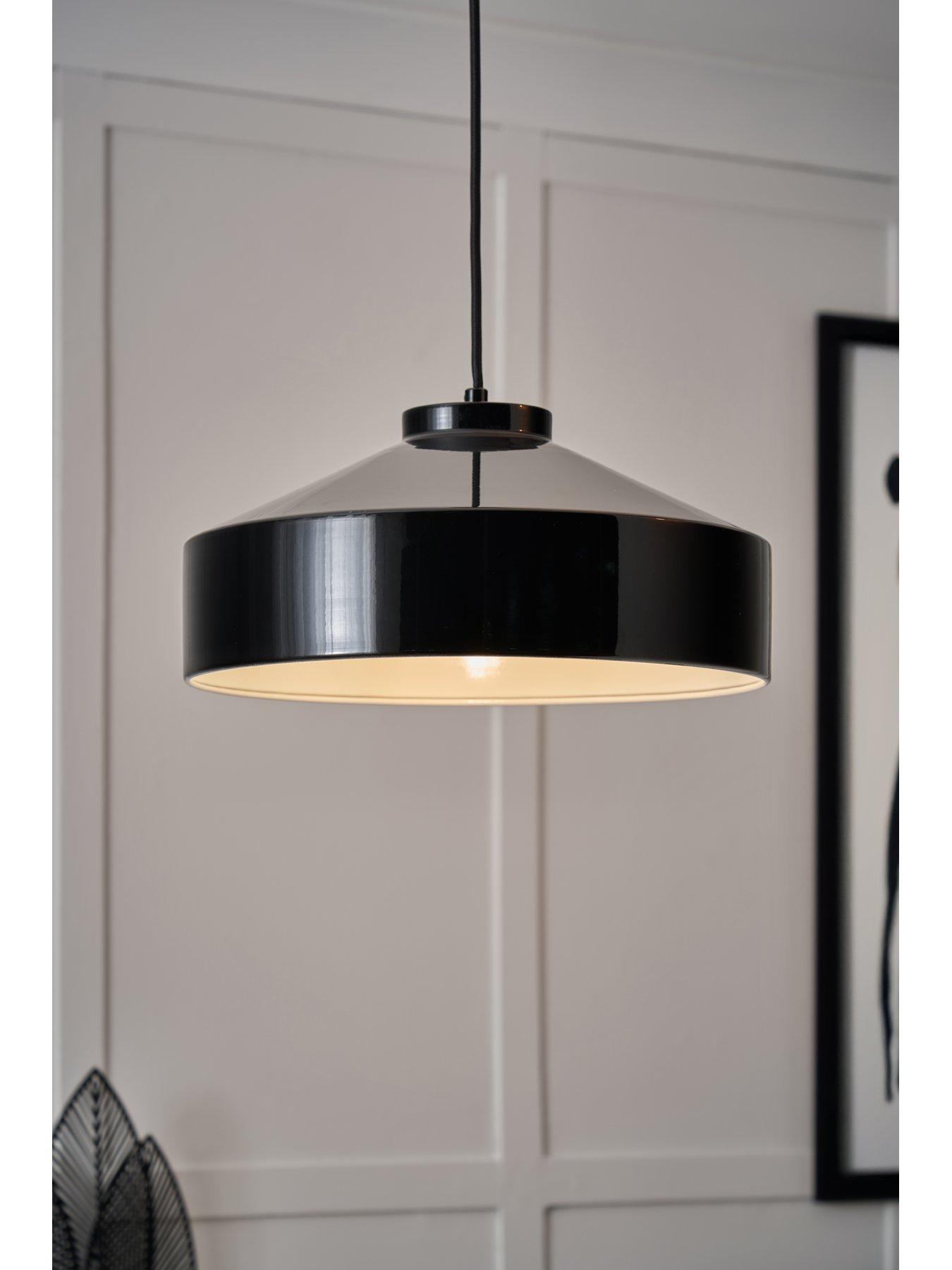 Very Home Gloss Black Metal Industrial Pendant Gloss Black Metal Industrial Pendant Depth: 35 CM Height: 100 CM Material Content: Metal Width: 35 CM Indoor / Outdoor: Indoor Maximum Wattage (in Kw): 10 Black Gloss 1 light Metal Pendant With Metal Chain 1 x E27 GLS Max 10 w Bulb not included Matching items available