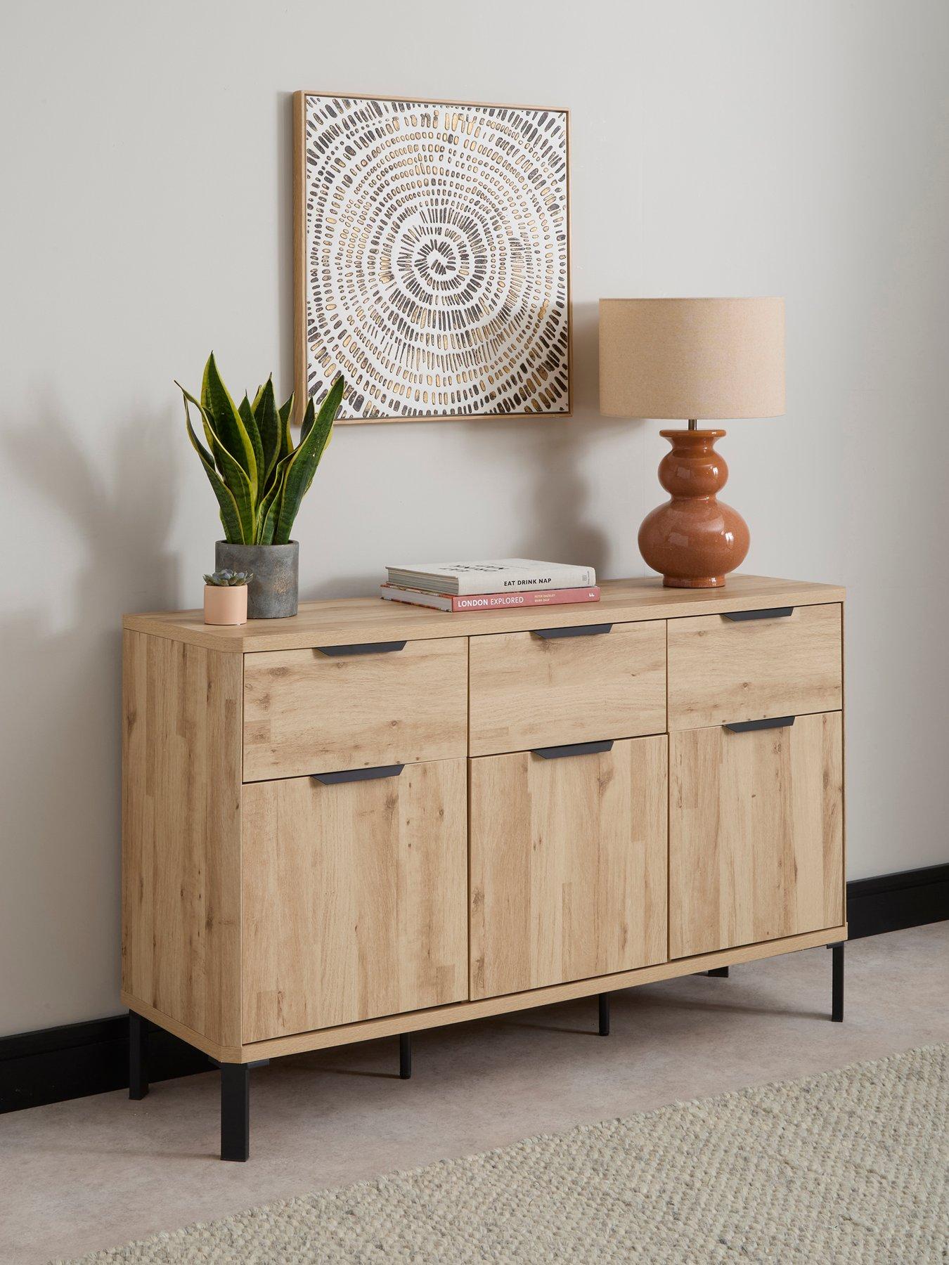 The Very Collection Harlem Large Sideboard In Light Oak Effect - Fsc Certified We Love This New Harlem Collection Of Furniture - A Wide Range With Pieces For The Bedroom As Well Your Living Areas, So You Can Spread The Style Throughout Your Space. The Light Oak-Effect Finish Features A Fashionable Butcher'S Block Design Which Creates An Eye-Catching Blend Of Grain Patterns And Colour Shades. A 3 Door Cupboard And 3 Drawers Give You Plenty Of Space For Dinner Party Essentials Or Clutter. Easy-Glide Metal Runners Ensure A Smooth And Friction-Free Action. For A Final Touch Of Style, The Flat Finish To The Corners Are Echoed By The Angle Of The Black Metal Feet Which Raise It Off The Floor. Search Harlem To See A Whole Host Of Matching Furniture In This Collection. Please Remember To Measure Your Available Space Before Ordering. Dimensions: Height 80, Width 130, Depth 39 Cm Assembly: Self Assembly Depth: 130 Cm Height: 80 Cm Material Content: Mdf & Pb Board, Foil Lamination Width: 39 Cm Finish Type: Wood Effect Number Of Doors: 3 Door Number Of Drawers: 2 Adjustable: N Number Of Doors: 3 Number Of Drawers: 3 Internal Drawer Height (In Cm): 36 Internal Drawer Width (In Cm): 34 Internal Drawer Depth (In Cm): 13 Number Of Internal Shelves: 3 Shelf Type: Adjustable Min Distance Between Shelves (In Cm): 19 Max Distance Between Shelves (In Cm): 40
