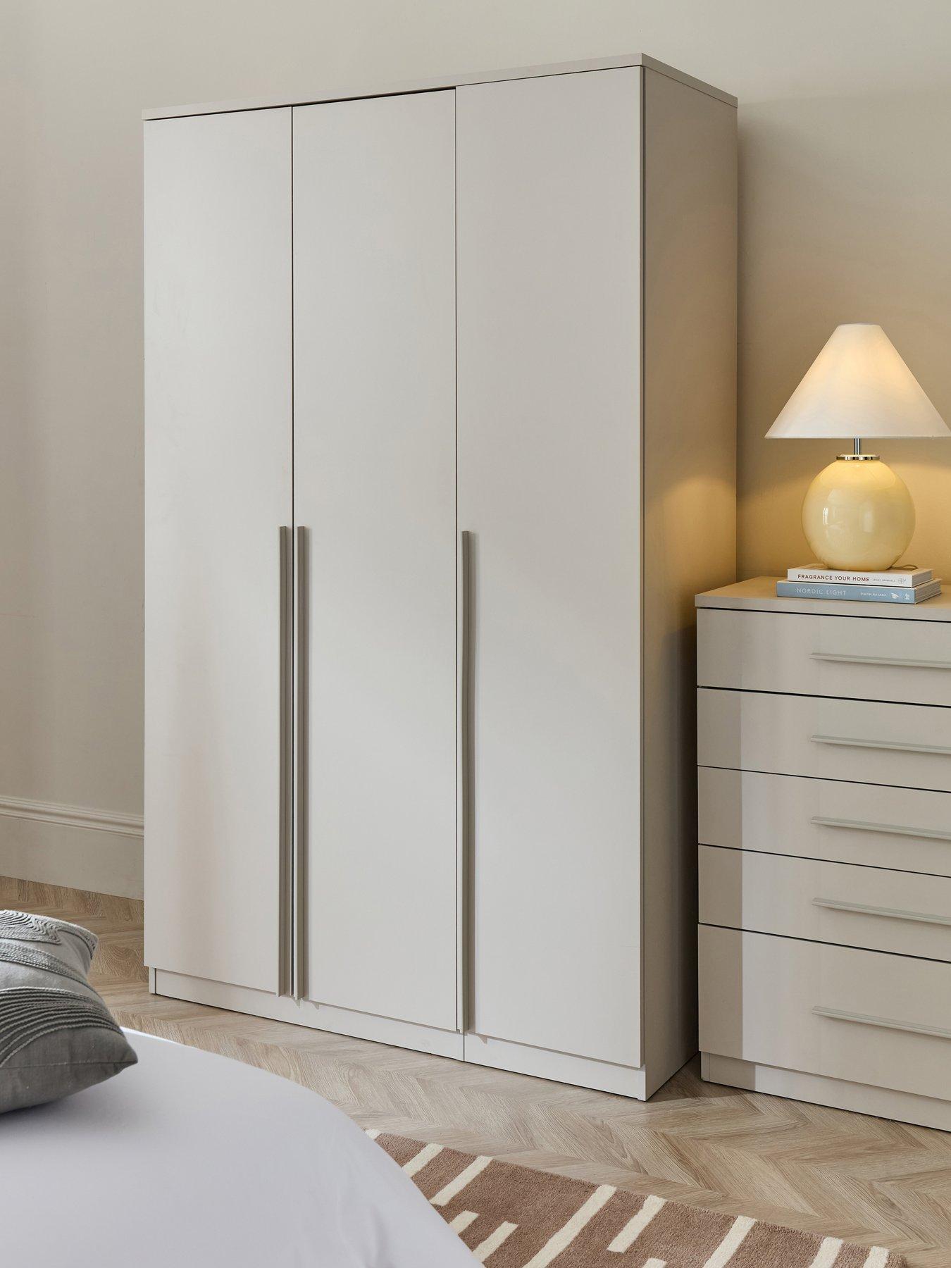 The Very Collection Murcia 3 Door Wardrobe In Oatmeal Stylish Natural Oatmeal Coloured 3 Door Wardrobe. Each Door Is Opened Or Closed Via A Long Slim Easy-Grip Handle. The Doors Are Held In Place With Large 6-Way Adjustable Metal Hinges. Internally An Offset Upright Divides The Space, One Side Benefitting From A Large Shelf And A Large Hanging Rail. Whilst The Other Section Feature 3 Adjustable Storage Shelves. Please Remember To Measure Your Available Space Before Ordering. Dimensions: Height 199, Width 121, Depth 53 Cm Assembly: Self Assembly Depth: 53 Cm Height: 199 Cm Width: 121 Cm Number Of Doors: 3 Door Number Of Shelves: 3