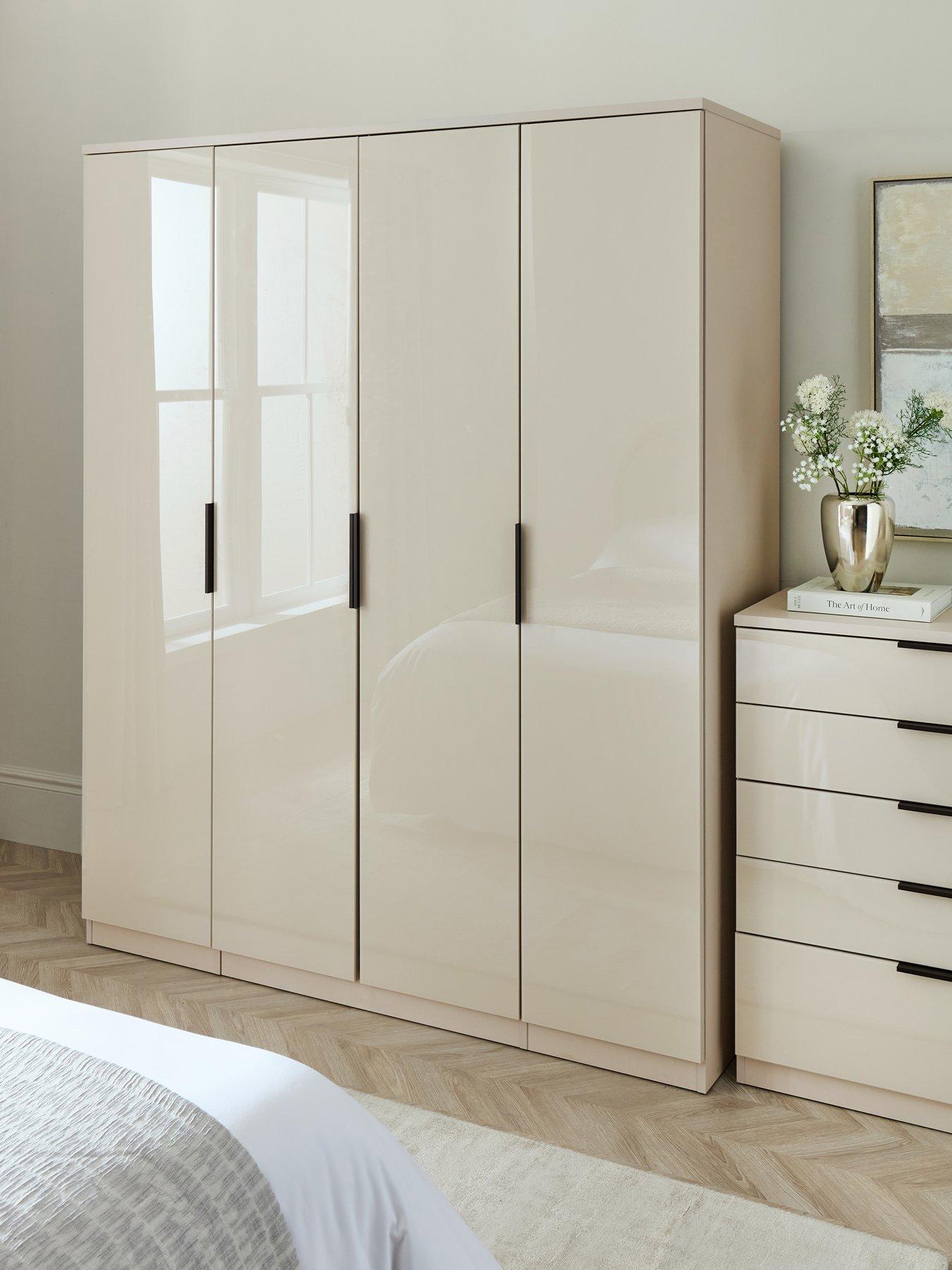 The Very Collection Palma Glass 4 Door Wardrobe In Oatmeal Breathtaking Furniture From The Very Collection, This Palma Wardrobe Has A Modern Oatmeal Colour And The Doors Are Detailed With Glass To Give Them A Spectacular Shine In Your Sleep Space. Finished With Black Metal Handles, Its Inner Is Divided Into Three Sections, Two With A Hanging Rail And High Shelf. Get The Look With More From The Palma Range, Which Is Available Separately. Please Remember To Measure Your Available Space Before Ordering. Dimensions: Height 199, Width 161, Depth 53 Cm Assembly: Self Assembly Depth: 53 Cm Height: 199 Cm Material Content: Particle Board & Glass Width: 161 Cm Number Of Doors: 4 Door Adjustable: N Storage: Hanging Glass Fronts