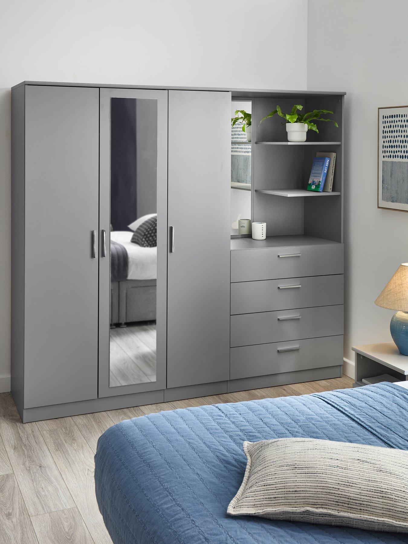 The Very Collection Panama 3 Door 4 Drawer Combi Wardrobe In Grey From The Great Value Panama Range Of Bedroom Furniture By The Very Collection, This Combi Wardrobe Comes In Modern Grey Finish To Update Your Sleep Space. The Wardrobe Contains Two Sections (One Wide, One Narrow), Each With Its Own Hanging Rail And High Shelf, While The Matching Interior Finish Ensures It Looks As Good On The Inside As It Does On The Outside. Four Drawers Sit On Easy-Glide Metal Runners For A Smooth, Friction-Free Opening, While The Open Section Features A Mirror Plus Shelving For All Your Beauty Essentials. The Wardrobe Is Finished With Metal Handles For A Sleek, Modern Accent. Get The Look With Other Very Home Panama Pieces To Give Your Bedroom A Consistent And Contemporary Look! Search Panama To See The Full Range. Please Remember To Measure Your Available Space Before Ordering. Dimensions: Height 181, Width 199, Depth 53 Cm Assembly: Self Assembly Depth: 53 Cm Height: 181 Cm Material Content: Partical Board, Foil Width: 199 Cm Number Of Doors: 3 Door Number Of Drawers: 4
