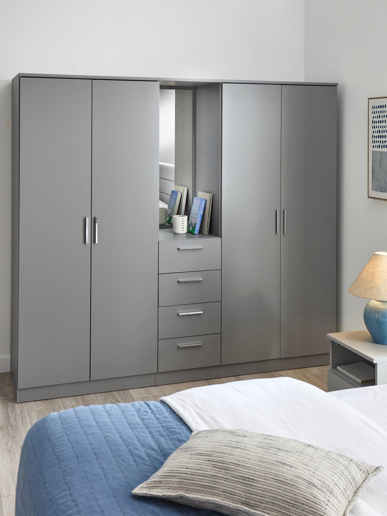 The Very Collection Panama 4 Door 4 Drawer Combi Fitment with Mirror in Grey From the great value Panama collection of bedroom furniture by The Very Collection, this combi fitment wardrobe comes in a grey shade. Each side contains a hanging rail and high shelf, while the matching interior finish ensures it looks as good on the inside as it does on the outside. The centre section contains four drawers that sit on easy-glide metal runners for a smooth, friction-free opening, while the open section features a mirror that provides the perfect space to style your hair or apply your makeup in the mornings. The wardrobe is finished with metal handles for a sleek, modern accent. Get the look with other Very Home Panama pieces to give your bedroom a consistent and contemporary look! Search Panama to see the full range. Please remember to measure your available space before ordering. Dimensions: Height 181, Width 199, Depth 53 cm Assembly: Self Assembly Depth: 53 CM Height: 181 CM Material Content: Partical Board, Foil Width: 199 CM Number of Doors: 4 door Number of Drawers: 4