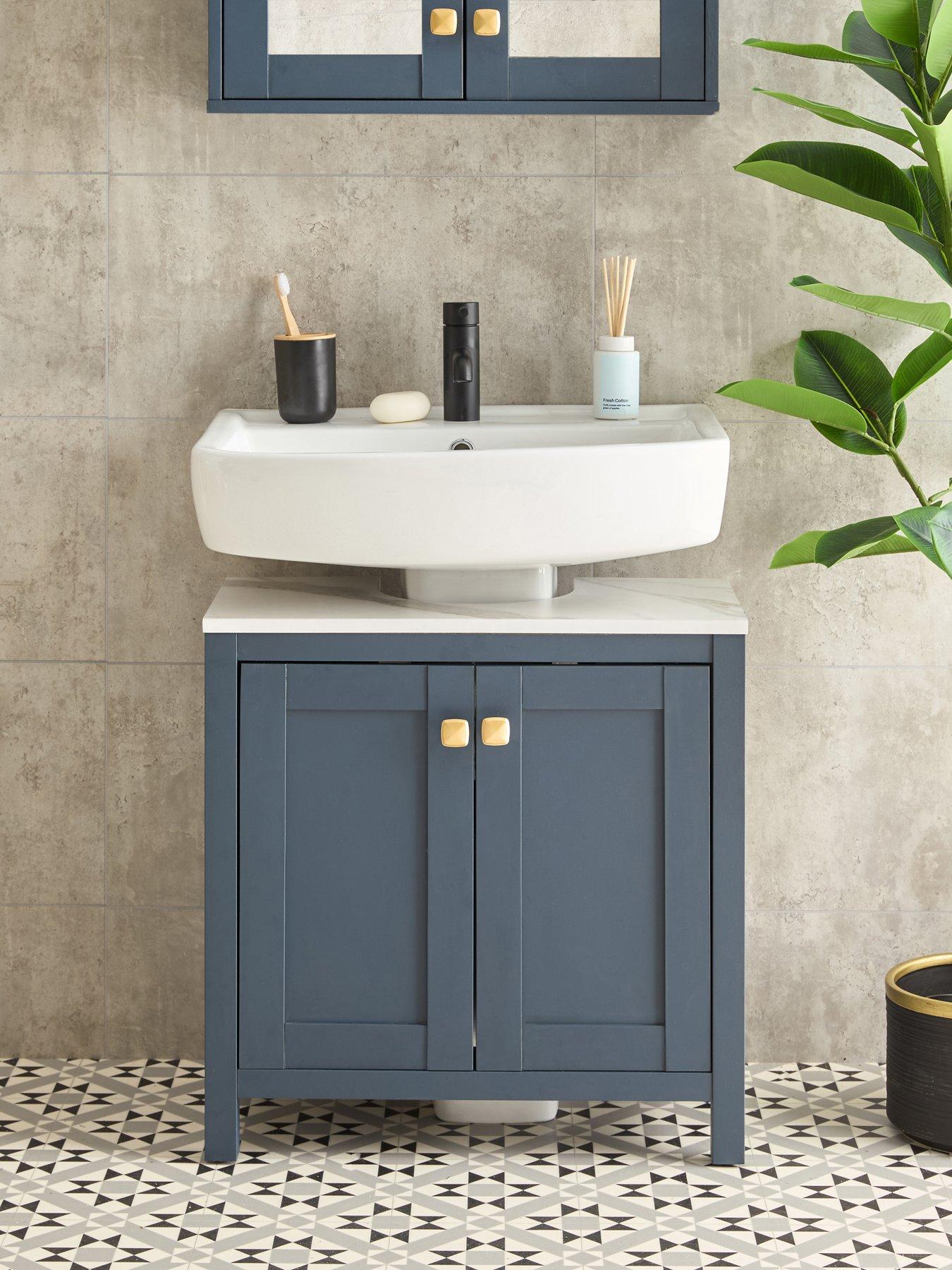 The Very Collection Rafferty Under Sink Cabinet Rafferty Under Sink Cabinet A Stylish And Practical Storage Solution, The Rafferty Cabinet Is Designed To Fit Under Your Sink. Making Clever Use Of A Space That Usually Gets Wasted. Two Doors With A Classic Panelled Design Open To Reveal Two Inside Shelves. Perfect For Storing Toiletries And Cleaning Products Out Of Sight. Timeless Blue Finish Is Complemented By Gold Handles And Marble Effect Top. Get The Look With Matching Bathroom Furniture From The Rafferty Collection, Which Is Available Separately. Assembly: Self Assembly Depth: 29.5 Cm Height: 60 Cm Material Content: Mdf, Pb Width: 60 Cm Handle Material: Metal Type: Auxiliary Handle Number Of Doors: 2 Door Number Of Shelves: 1 Adjustable: N