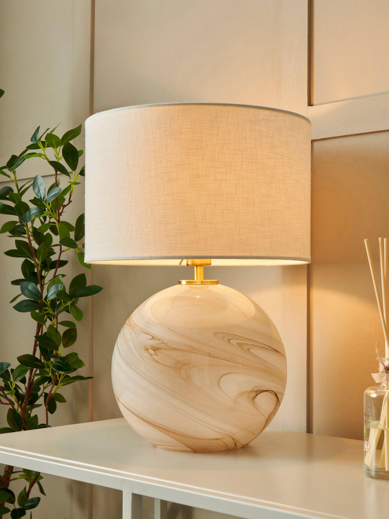 The Very Collection Swirl Glass Marble Table Lamp Swirl Glass Marble Table Lamp Depth: 29 Cm White Marble & Brown Swirl Table Lamp Height: 41 Cm Material Content: Glass & Fabric Width: 29 Cm With Brass Trim With White Shade 1 X E27 Gls Max 10 W Bulb Not Included Matching Items Available Hand Crafted So Finish May Vary