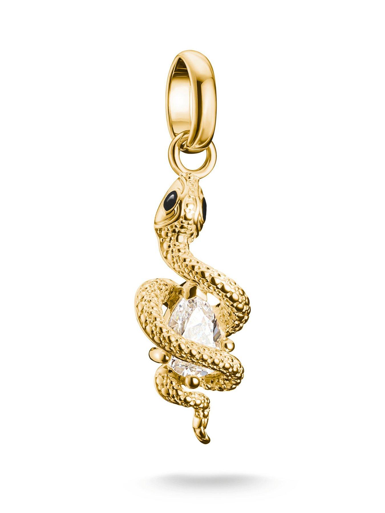 Thomas Sabo Charm Connect snake pendant with stone "Gold-plated snake charm - Connect - The filigree eyelet of the charm made from 925 silver with 18k gold plating allows you to create creative jewellery combinations on necklaces and bracelets - to suit your personal style. - The three-dimensional snake winds elegantly around a drop-shaped cut cubic zirconia in white and adds a powerful accent to your look. - Style your look however you like and mix and match the charm pendant with other pendants that tell your own personal story." Height: 25 MM Width: 8 MM Fashion Jewellery Type: Bracelets Metal Type: Gold Plated Silver Stone Type: Gem Snake motif zirconia white