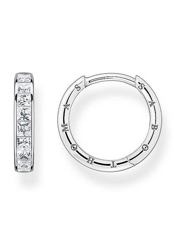 The elegant design is timeless: Stylish, stone-embellished hinged hoops. The 18 hand-set white zirconia stones shine in a classic baguette cut. The open claw setting makes the play of colour of the stones particularly intense when the light falls on them. Can be combined in a variety of ways with other jewellery collections with engraving on the sides. Brand: Thomas Sabo Sparkling Heritage: Sparkling hinged hoops Stone: White Zicornia 925 Sterling Silver