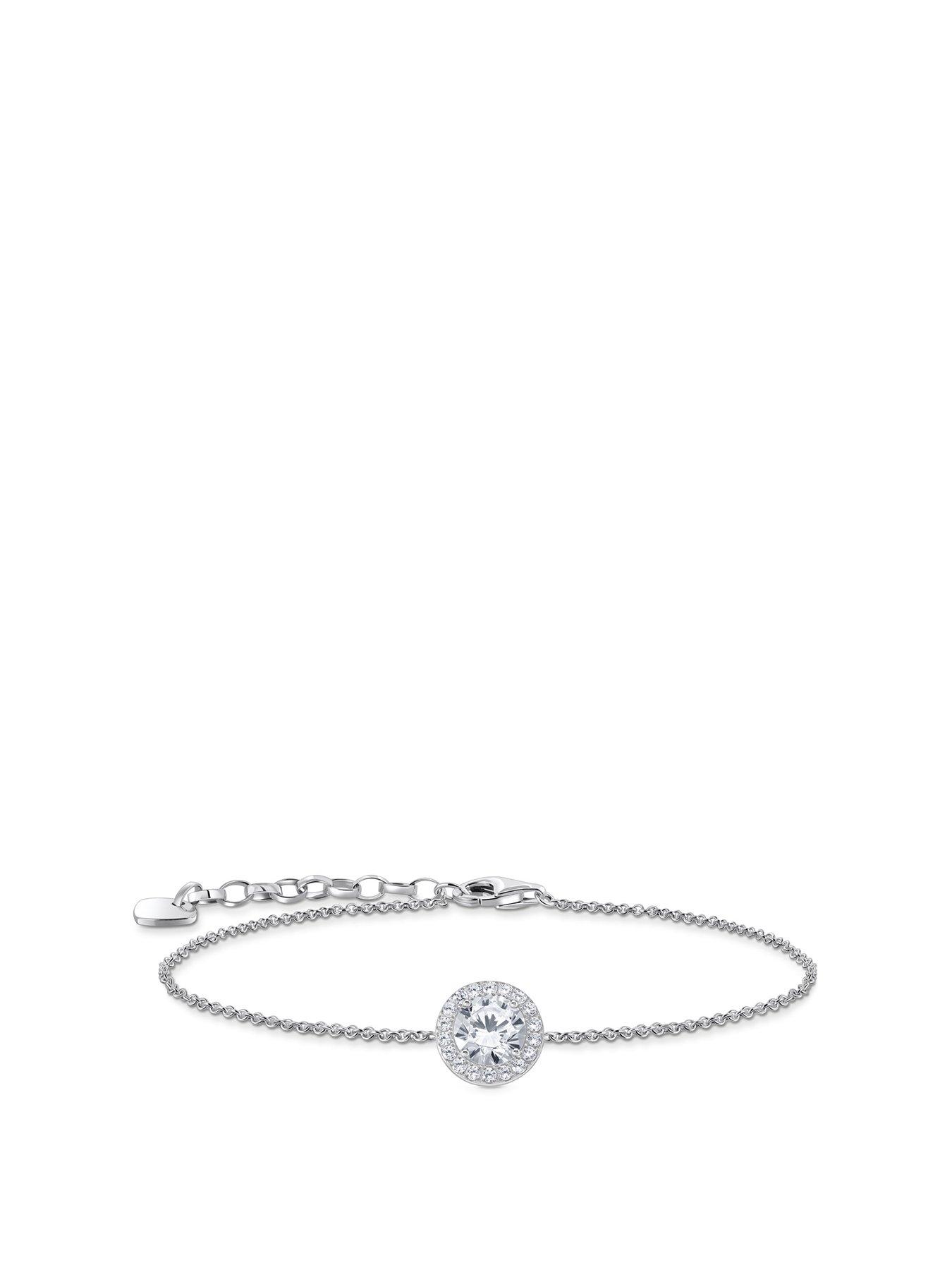 Thomas Sabo Silver bracelet with halo pendant Bracelet with halo pendant Romantic sparkle: This intricately crafted bracelet with pendant attracts attention at any time of day. The large brilliant-cut zirconia stone takes centre stage on the pendant. The ring around the stone is also set with small, white zirconia stones. - Made from925 silver - Individually adjustable in length from 16 to 19 cm Depth: 1 MM Height: 9.5 MM Width: 9.5 MM Fashion Jewellery Type: Bracelets Metal Type: Silver Stone Type: Semi-precious silver-coloured 925 silver lengthwise adjustable zirconia white lobster clasp