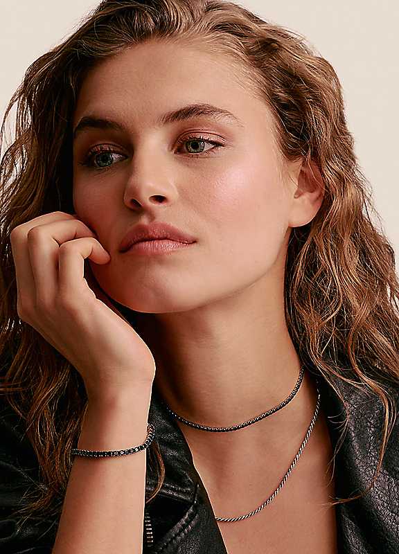 Sparkling Black Tennis ChainClassic meets cool: this delicate tennis necklace in blackened 925 sterling silver makes a confident statement with its finely set black zirconia stones. The uniform round setting of the 2.5 mm stones ensures elegant brilliance with a subtly rebellious touch. Thanks to the extendable chain length of up to 42 cm, the design can be worn flexibly - solo as a highlight or combined in a layered look. A versatile companion with understatement - for those who love clean lines and strong accents.925 Sterling SilverChain length approx. 42 cm | delicate silver necklace, adjustable chain necklace, black tennis chain, minimalist silver necklace, cubic zirconia tennis necklace, sterling silver tennis necklace, black chain necklace