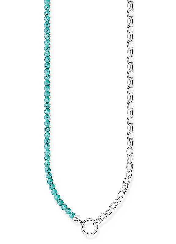 Charm holder: Link chain with imitation turquoise beads.Brand: Thomas SaboFascinating look thanks to the combination of link chain with the imitation turquoise beaded necklaceThe charm holder with THOMAS SABO engraving as a ring connects both elements of the chainElaborately designed ends with engraved linesLength can be adjusted with extension chain from 40 to 45 cmCan be combined with different charm pendants925 Sterling silver/ simulated turquoise