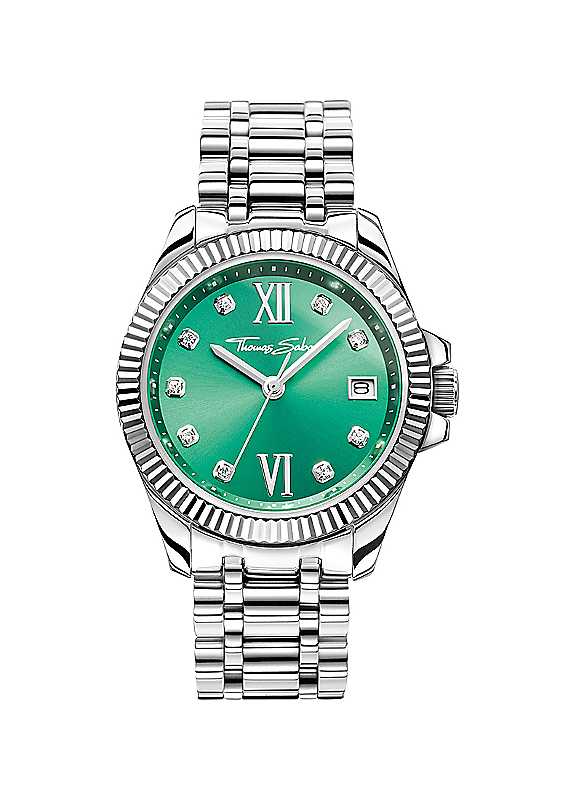 Watch with a green dial: The highlights of this unisex watch are the white navette-cut zirconia stone indices on the green dial. They have been set by hand in fine bar settings. The sunburst dial features Roman numerals at 12 and 6 o'clock, while the stones and the trendy pink colour create a contemporary look. The bezel has a high-quality fluted finish. As a small, additional detail, the crown for setting the time and date is adorned with a TS logo. Worn on the wrist, the watch has a classic, solid stainless steel wrist strap, which can be adjusted in length by removing individual link elements.Brand: Thomas Sabostainless steel case, stainless steel bracelet