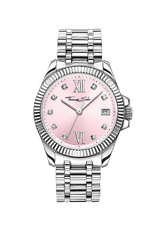 Watch with a pink dial: The highlights of this unisex watch are the white navette-cut zirconia stone indices on the pink dial. They have been set by hand in fine bar settings. The sunburst dial features Roman numerals at 12 and 6 o'clock, while the stones and the trendy pink colour create a contemporary look. The bezel has a high-quality fluted finish. As a small, additional detail, the crown for setting the time and date is adorned with a TS logo. Worn on the wrist, the watch has a classic, solid stainless steel wrist strap, which can be adjusted in length by removing individual link elements.Brand: Thomas Sabostainless steel case, stainless steel bracelet