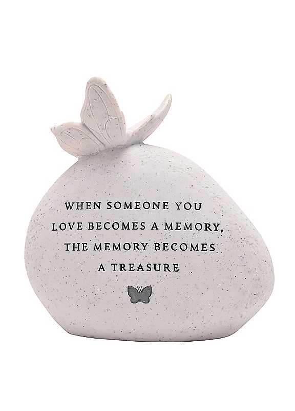 The Thoughts of You Butterfly Graveside Pebble - A Memory is a touching keepsake, beautifully designed to honour loved ones. This heart-shaped stone, adorned with a delicate butterfly, carries an emotional message that resonates, capturing treasured memories.Features a sentimental engraved quote, 'When someone you love becomes a memory, the memory becomes a treasure'Designed with a butterfly symbol, adding charm & serenityPresented in a soft white hue, symbolising peace & purityPebbleDimensions approx. 7D x 17W x 16.5H cm
