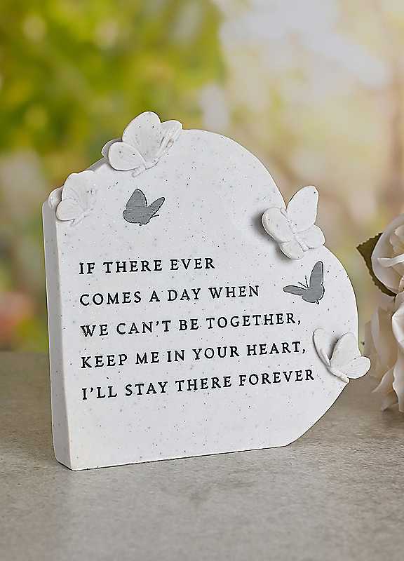 Cherish your treasured memories with the Thoughts of You Butterfly Graveside Standing Heart. This sentimental keepsake, adorned with delicate butterfly silhouettes, captures the essence of remembrance and love. Its heart-warming message serves as a gentle reminder of the enduring bond with a loved one, even in their absence.Features a heartfelt message that beautifully encapsulates feelings of love & longingThe heart shape & butterfly motifs symbolise transformation & enduring loveDesigned to stand firm, it's a lasting testament of cherished memoriesPebbleDimensions approx. 6D x 17.5W x 18H cm