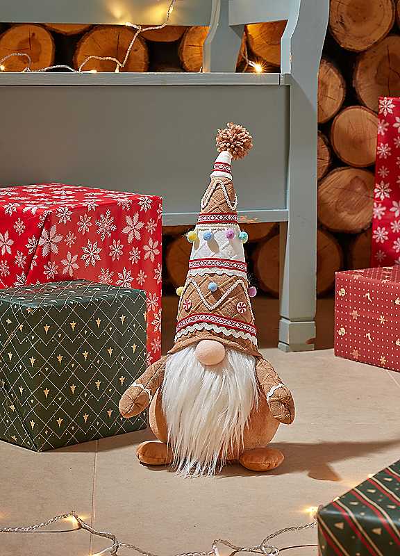 Freshly baked to bring extra sweetness to your Christmas. Fall in love with this adorable and distinctly festive Gonk. This Gingerbread Christmas Gonk figure is the ideal way to bring some fun into your festive decorating this Winter! Made with a soft plush fabric this novelty decoration will sit wherever you choose this festive season, generating a talking point wherever it is placed!Brand: Three KingsIndoor use onlyProduct care: Wipe clean only, avoid household cleaners/abrasivesPolyesterDimensions approx. 40H x 22W x 14D cmThe images of the products on our website are for illustrative purposes. We endeavour to display as accurately as possible the colours of our products on our website, however, as different computers and mobile devices display colour tones differently we cannot guarantee the complete accuracy of the pictures or photographs that are shown.