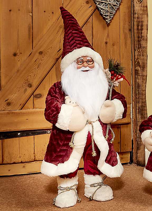 Fall in love with this traditional Santa in beautiful burgundy!Quilted, plush material with faux fur trim.Perfect addition for a Christmas display.Height approx. 85 cm | big christmas decorations, father christmas ornaments, large christmas decor, burgundy christmas ornaments, traditional christmas ornaments, large christmas ornaments, fabric christmas ornaments, decorative father christmas, burgundy christmas decor, traditional christmas decor, quilted christmas ornaments