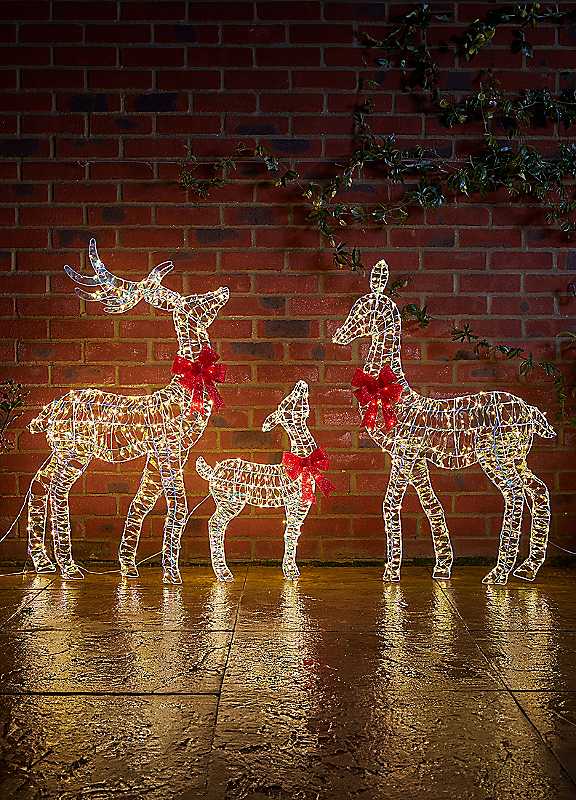 Open your hearts and your home to this charming reindeer family this Christmas. With its wonderful colour and bright LEDs it is sure to be a show stopper this winter. Brand: Three Kings Mains powered Number of LEDs: 750 Bulb Colour: Warm White Low Voltage Transformer Suitable for indoor & outdoor use Metal & Plastic Stag length approx. 1.1 m Doe length approx. 1 m Fawn length approx. 63 cm The images of the products on our website are for illustrative purposes. We endeavour to display as accurately as possible the colours of our products on our website, however, as different computers and mobile devices display colour tones differently we cannot guarantee the complete accuracy of the pictures or photographs that are shown. | light up christmas, metal christmas ornaments, reindeer christmas decorations, led christmas lights