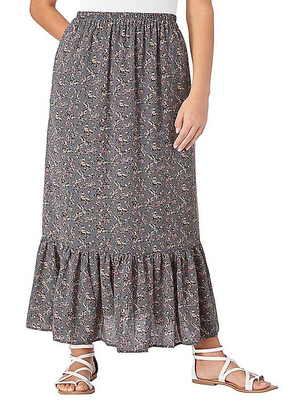 Romantic floral skirt with a wonderfully comfortable, elasticated waistband. The hem features a playful ruffle which adds detail and texture. Elasticated waist Washable 100% Polyester Petite length approx. 82 cm (32 in) (size 16P) Regular length approx. 90 cm (36 in) (size 16)