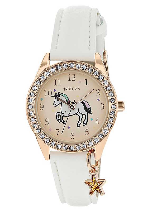 The Tikkers unicorn sparkle is one of our most magical watches! A super cute unicorn dances across the soft rose gold dial, framed with sparkling stones and finished with a glittery star charm. Complimented by a soft white leatherette strap. Presented in a super sparkly rainbow giftbox, which includes a sheet of exclusive Tikkers stickers! All Tikkers watches have a one year guarantee.Brand: TikkersUnicorn Stone Set WatchMulticolour Fun DialAlloy & PU | casual wrist watch, quartz wristwatches, watch strap buckle, rhinestone watch ladies, analog watch numbers, round dial watch, white strap watch