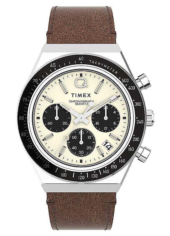 Roar across the finish line with our high-performing Q Timex Chronograph. Inspired by the original motoring watches that graced the tracks of Europe's most iconic races, this timepiece celebrates the endurance of our legendary 1970s Q Timex. An ultra-precise chronograph movement and black tachymeter bezel recreate the finesse and function of a true racing watch, allowing you to determine elapsed time and average speed like the greatest daredevils in motorsports.Contrasting sub-dials, a date feature, hand-applied dimensional indices, and an updated Q Timex logo against a cream dial, while a brushed and polished stainless-steel case and crown bring dynamism and durability to its retro construction. Infinitely wearable, a brown leather strap with quick-release spring bars makes for a sporty presentation that's ready to hit the road whenever you are.Brand: TIMEX