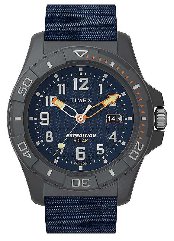 Rain or shine, inland or coast - Expedition North® goes the distance. Inspired by those who seek to preserve our, the new Expedition Free-Dive Ocean is equipped with several features: a solar-powered movement that lasts up to 4 months and eliminates the need for battery changes; a rugged blue case and comfortable strap made of tideTM upcycled, ocean-bound plastic; and all-paper packaging. Of course, this collection doesn't skimp on style either - the substantial 46mm case features a diver-inspired design with a unidirectional bezel and sturdy crown guard.The blue dial, featuring nautical patterns reminiscent of previous Timex diver-style watches, boasts a date window and large, easy-to-read hand and hour markers. Finally, its 50-meter water resistance rating allows you to make the most out of your time in the ocean without leaving this piece ashore.Brand: TIMEX