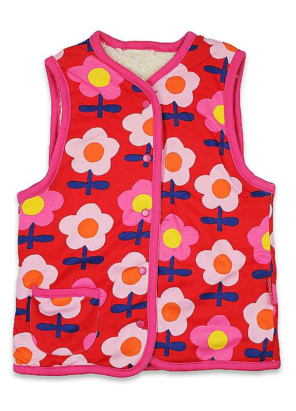 Stay bold and friendly with our pink flower print reversible gilet. Boasting a vibrant dark pink foundation with a playful light pink, orange, and blue flower print, this gilet embodies both fashion and sustainability. The practical side pocket and popper closures make this one-of-a-kind piece even more versatile and essential. Plus, it's fleece-lined and reversible - perfect for little ones! Super soft to the touch.GOTS-certified cottonAzo-free dyesMachine washable at 30°C100% Organic Cotton | vest with pockets, girls gilet, reversible gilet, childrens fleece coats, cotton sleeveless jacket, infant fleece jacket, floral fleece jacket, gilet fleece, fleece lined jacket, reversible fleece jacket, flower vest, organic cotton coat, quilted gilet, kids vest, toddler fleece jacket, floral quilted jacket, reversible cotton jackets