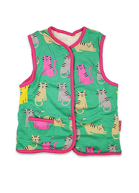 Keep your little one cosy and stylish with our kitten print reversible gilet. Made from GOTS-certified cotton and dyed using friendly azo-free dyes. The super soft, fleece-lined inside is perfect for chilly days. Meow! Super soft to the touchGOTS-certified cottonAzo-free dyesMachine washable at 30°C100% Organic Cotton | animal print coats, cotton jacket, gilet fleece, reversible fleece jacket, toddler fleece jacket, green fleece jacket, printed fleece jacket