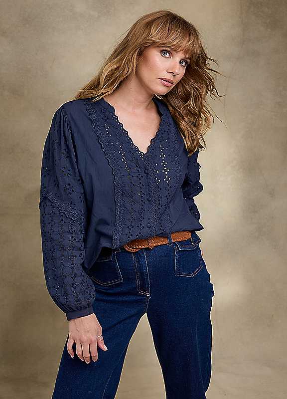 Introducing our Navy Broderie Blouse from the exclusive Together range. Crafted with intricate broderie detailing, this classic navy piece effortlessly blends elegance and versatility for a sophisticated and timeless wardrobe essential.Brand: TogetherMachine washable100% CottonLength approx. 64 cm (25 in)
