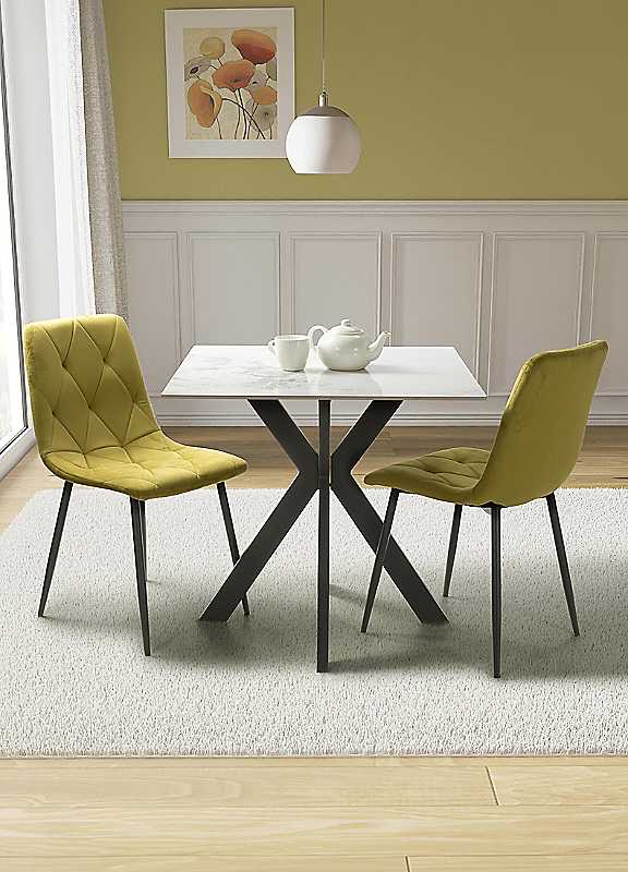 A space saving dining set in glossy marble effect finish. The 80cm square ceramic tabletop is supported by a signature X shaped frame rendered in fashionable black metal and is complemented by 4 sloped contemporary dining chairs, upholstered in sleek brushed velvet fabric. Enhance your dining space with this stylish and functional dining set which combine aesthetics with practicality.Dimensions Table: H84 x W80 x D80cmDimensions Chair: H84 x W43 x D56cmSpecifications Material: Ceramic, MetalSuggested Number of People for Assembly: 1/2Tool Kit Included: Yes Self-AssemblyManufacturer's 1 year guaranteeProduct Care: Wipe clean only, avoid household cleaners/abrasivesPlease remember to measure your available space before ordering. If using on an un-carpeted floor we recommend rubber or felt protection pads be used under the legs to avoid damage to your floors.