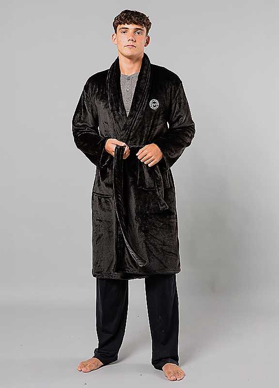 This plush dressing gown from Tokyo Laundry is a great addition to your night-time essentials. Features shawl collar, two front pockets, belted tie fastening, and Tokyo Laundry felt patch logo.Machine washableFollow care label100% PolyesterKeep away from fire. | soft plush robe, polyester robe, black dressing gown, wrap robe